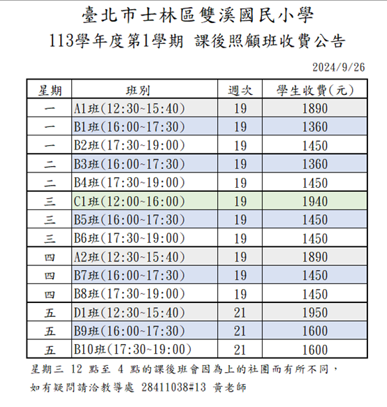 各班別收費可參閱圖片,有疑問請洽教導處黃老師,(02)2841-1038分機13