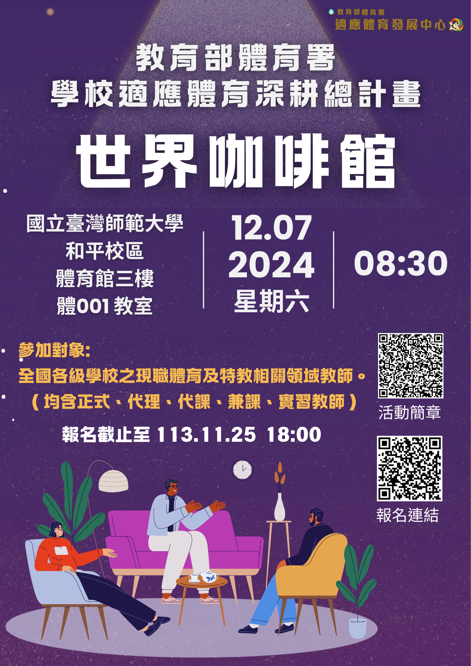 一、依據教育部體育署113年10月29日臺教體署學(二)字第 1130040596號函辦理。 二、為促進體育及特教相關之教育工作者能自由交流觀點,透 過有意義的對話激發集體智慧來探索融合式體育課程設計 之新思維及解決教學困境,提升融合式體育教學方式及策 略專業能力,該署特委請國立臺灣師範大學辦理旨揭活 動。 三、、本案活動資訊摘要如下,詳見附件簡章: (一)參與對象:全國各級學校之現職體育及特教相關領域教 師(均含正式、代理、代課、兼課、實習教師)。 (二)活動時間:113年12月7日(星期六)上午8時30分至下午12時30分。 (三)活動地點:國立臺灣師範大學和平校區I體育館3樓體 001 教室(臺北市大安區和平東路一段162號)。 (四)報名日期與方式:自即日起至113年11月25日(星期一) 下午6時止,採線上報名,請逕至全國教師在職進修資訊 網或表單:https://forms.gle/BQmp2GWYK5vyXGYS9完成 報名手續。 (五)本次研習費用為免費,提供研習參與證明與研習時數。 四、請貴校逕依權責核予參加人員公(差)假登記。 五、本案如有相關詢問事宜,請逕洽國立臺灣師範大學體育與 運動科學系鄭凱云專任助理(電話:02-7749-3199;電子 信箱:ntnuape@gmail.com)。