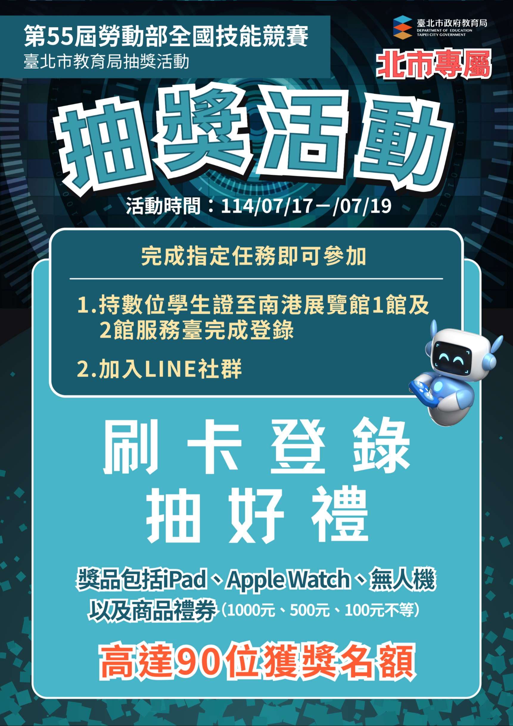 一、依據勞動部勞動力發展署技能檢定中心114年2月17日技競 字第1142100090A號函及本局114年2月25日北市教職字第 1143039872號函辦理。 二、旨揭競賽活動訂於114年7月17日(星期四)至7月19日(星 期六)假臺北市南港展覽館1、2館(臺北市南港區經貿二 路1、2 號)舉行,本次辦理青年組56職類與青少年組13職 類,共計69職類,為年度技職教育盛事。 三、為推動技職教育向下扎根,強化本市學生了解技職教育及 國際技能趨勢,歡迎本市親師生赴全國技能競賽參訪。屆 時現場將展示多元職類技能,涵蓋製造工程、營建技術、 資訊與通訊、運輸與物流、社會與個人服務、藝術與時尚 等領域,結合職涯探索體驗,拓展學生視野。四、現場提供本市學生限定好禮抽獎活動,凡本市各級學校學 生持數位學生證至南港展覽館1館及2館,至大會服務臺完 成登錄即可參加抽獎,獎品包括平板電腦、智慧手錶、無 人機、以及商品禮券(1000元、500元、100元不等),高 達90位獲獎名額。 五、旨揭競賽資訊請洽以下宣傳平臺,請各校於校園佈告欄、 跑馬燈或相關處室協助宣傳。 (一)活動官網:https://worldskillstw.wdasec.gov.tw/。 (二)FaceBook:https://www.facebook.com/WDASEC。 (三)Instagram:https://www.instagram.com /worldskillstw/。