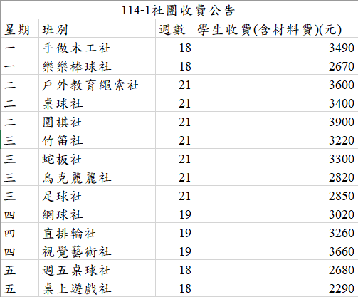社團收費如圖,有疑問可洽教導處丘老師(分機14)